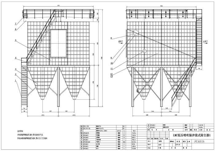 (1)鑄造廠電爐布袋除塵器 結構 點 除塵器中部箱體為園形筒狀結構,設計壓力0.25MPa,材質為Q345R,板厚14mm以上。其上設: 檢修人孔。 箱體設氮氣吹掃系統,用于qingchu積聚的灰塵和筒體煤氣置換吹掃; 高爐布袋除塵器 高爐布袋除塵器(2張) 儀表壓縮空氣系統,用于閥門控制;設人工灰塵檢測口,方便取樣化驗。 懸掛式箱體支座。煤氣進口接管設相應導流配氣裝置。 高爐布袋除塵器頂部采用符合/T4746-2002標準要求的正橢圓形封頭,壁厚16mm以上,材質Q345R。凈煤氣從箱體頂部接出,在封頭上設有anquan閥及放散管。 高爐布袋除塵器下部采用錐形灰斗,材質Q345R,板厚14mm以上,錐形灰斗錐角為50°,確保灰塵順利排出。下錐體上設雙路蒸汽保溫盤管防止煤氣結露和粉塵結塊而影響排灰。灰斗上下高低灰位各設一個熱電阻檢測灰斗的灰位,并設有倉壁震動器兩套和氮氣吹掃管。 除塵器進、出口管道分別設置全封閉式電動插板閥、氣動三偏心蝶閥、大拉桿波紋補償器、手孔。