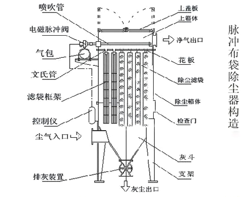 脈沖袋式除塵器的結(jié)構(gòu)圖可以了容易了解它的結(jié)構(gòu)由哪些部分組成: